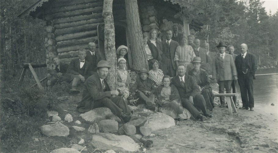 Rautalampilainen seurue Koskelon kalamajan edustalla 1910-luvulla. Mäntyyn nojaa kirjastonhoitaja Hanna Wepsäläinen (myöhemmin Malinen). Kolmas oikealta on Karjalan kartanon omistaja Rolf Roschier. Kuva: Rautalammin museo.