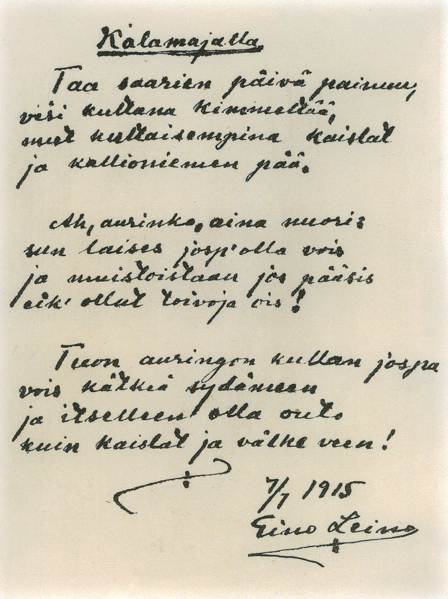 Eino Leinon omakätisesti Rautalammilla 1915 kirjoittama runo Kalamajalla. Kuva: Rautalammin museo.
