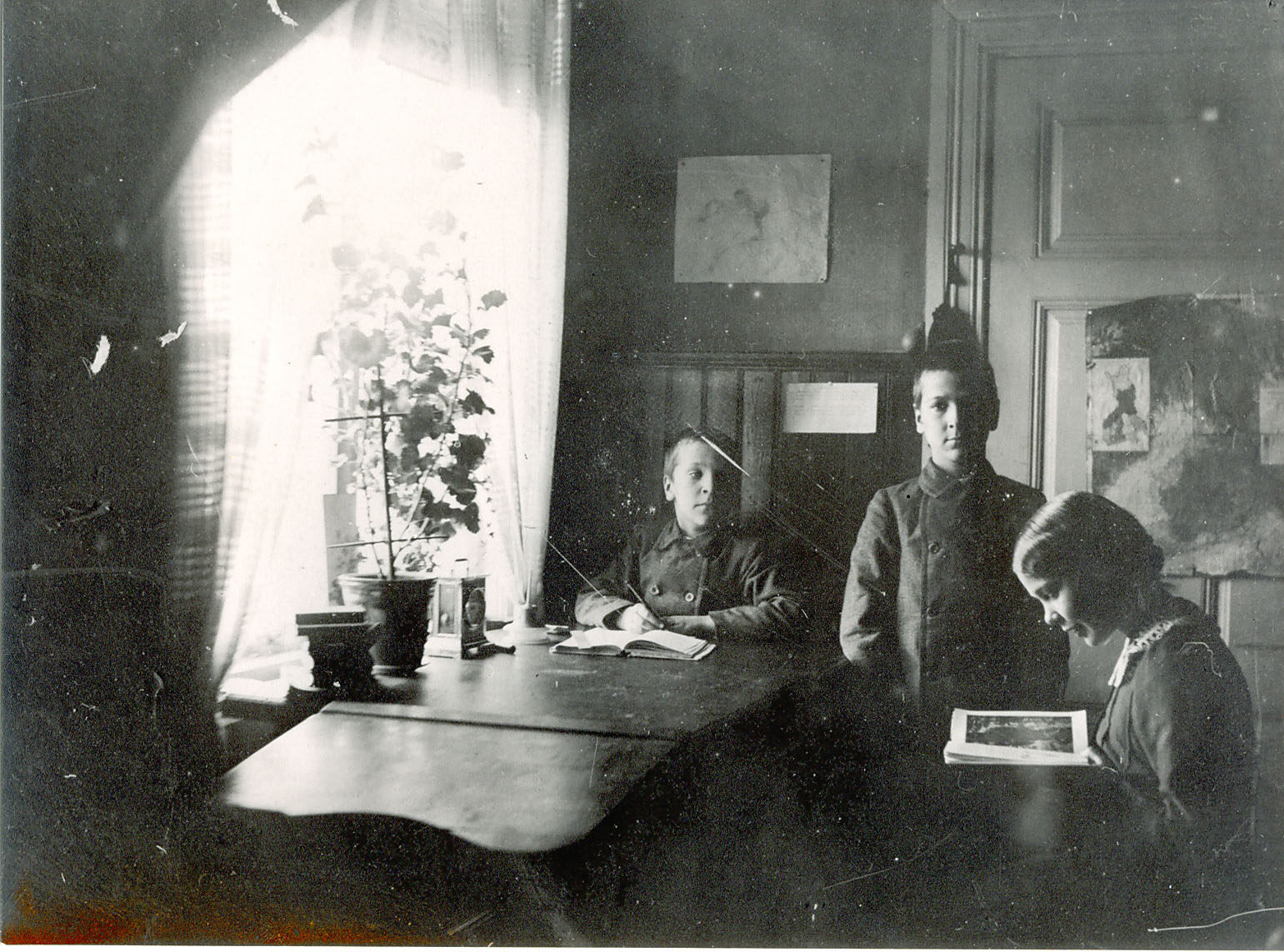 Koskenpappilan pojat Toivo ja Palle kotiopettajattarensa kanssa Koskenpappilan salissa. Kuva: Rautalammin museo.