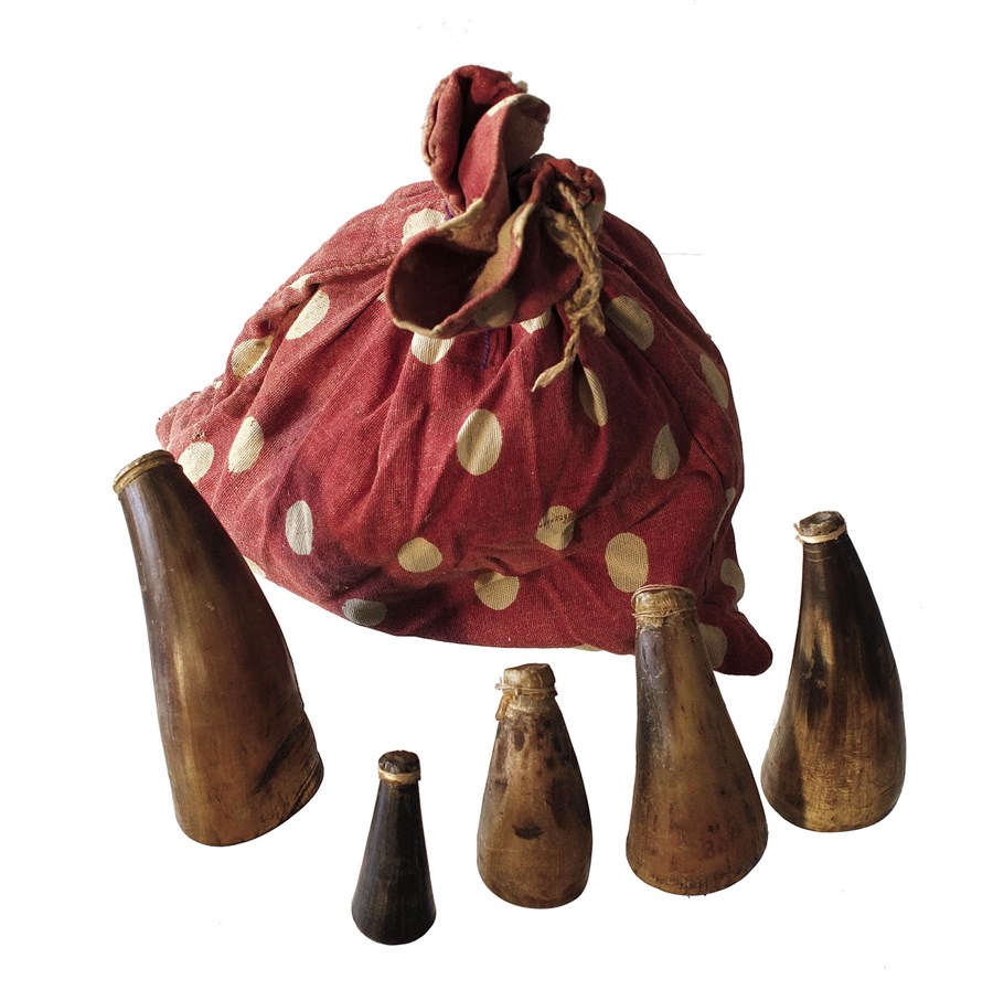 Kuppaus oli yksi kansanparannuksen menetelmistä, joilla tauteja aiheuttavaa pahaa verta pyrittiin poistamaan kehosta. Lehmänsarvista valmistetut kupparinsarvet ja pussi Rautalammin museon kokoelmista. Kuva Kari Jämsén/Rautalammin museo.